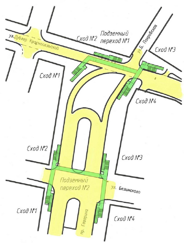 1) Подземный пешеходный переход с выходами на обе стороны улицы Красносельская;