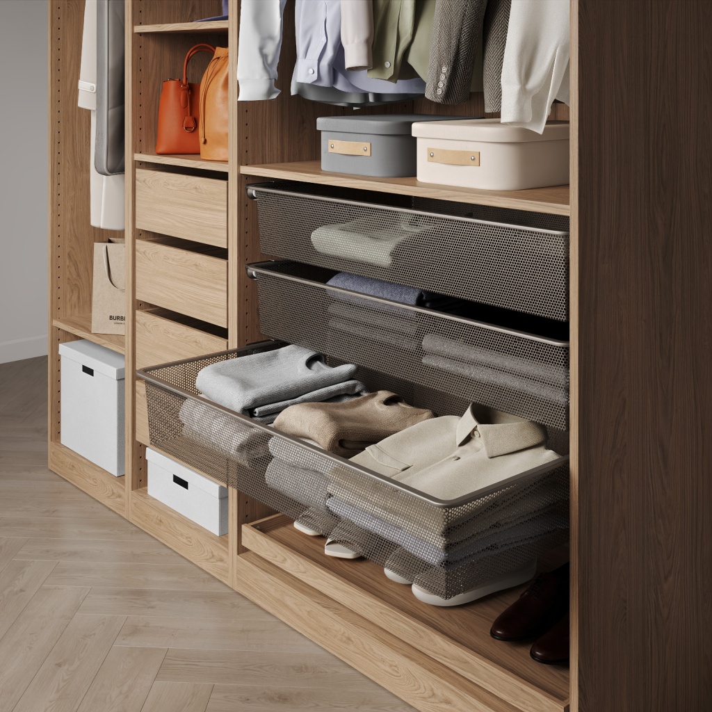 При необходимости обновить фасад гардеробной системы можно заменить распашные двери Пакс аналогичными по размеру дверями Блокс, выбрав новый для себя оттенок или фактуру. А внутренние элементы Блокс помогут оснастить шкафы шведского производителя новым наполнением: штангой, полками, выдвижными ящиками или корзинами. При этом если вы выбираете внутреннее наполнение классического белого цвета, оттенки двух брендов совпадут идеально. Надо заметить, что и фурнитура Блокс (петли, крепеж) идеально подойдет для обновления шкафов Пакс.