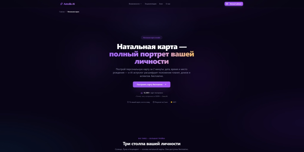 Построить натальную карту с точными расчётами и AI-интерпретацией можно бесплатно на astrolloai.ru/natal-chart. Бесплатная версия даёт Big Three и 3 вопроса AI-астрологу — достаточно, чтобы провести свой собственный «тест на точность».