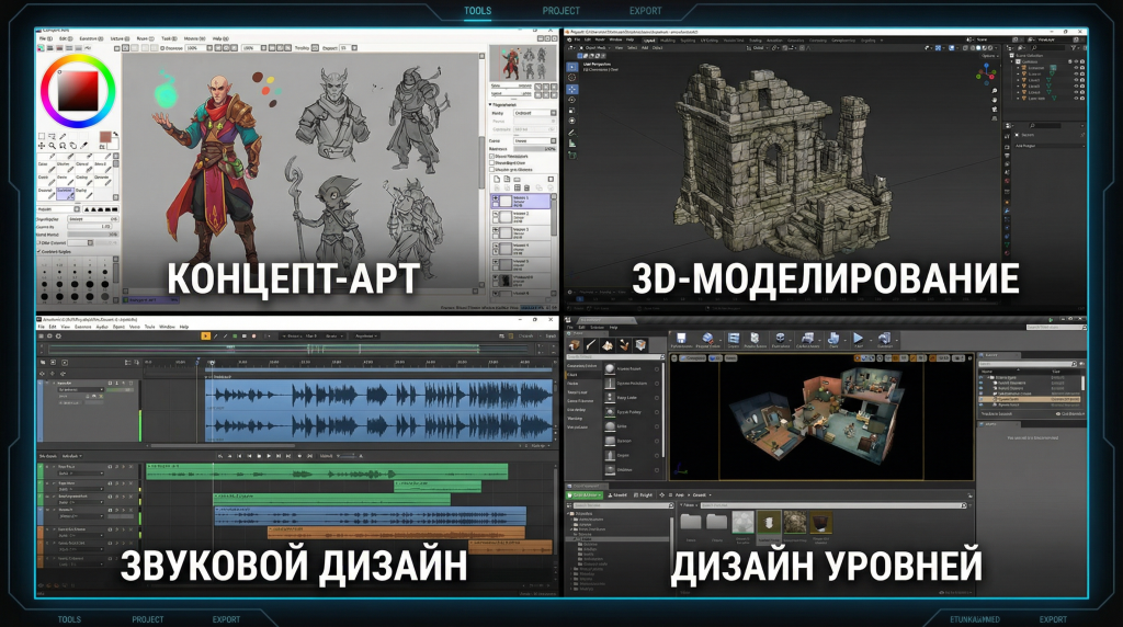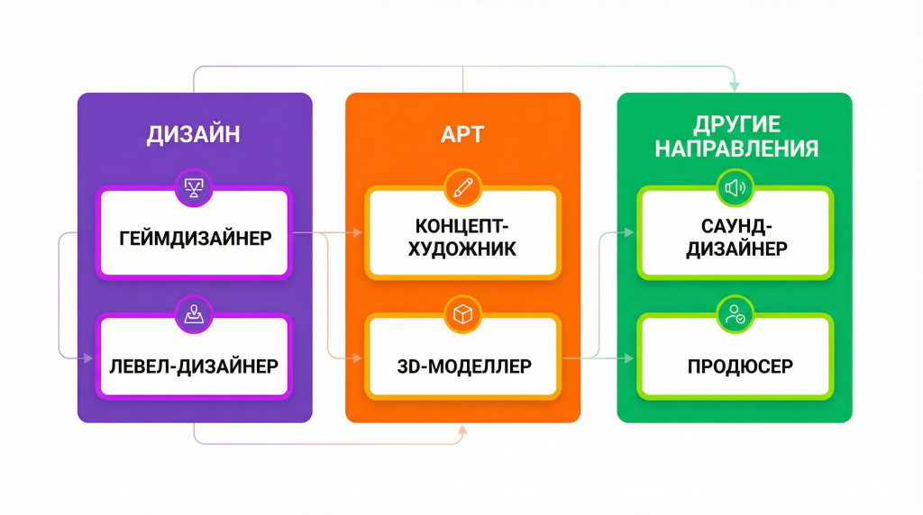 Помимо создания графики и кода, игре нужны голос, эффекты и контроль качества. Эти задачи решают профильные специалисты, без которых проект останется «сырым» черновиком. Каждый игровой разработчик в этих нишах отвечает за свою часть:
