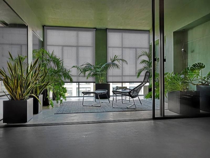 Солнцезащитные системы компании работают с этим материалом точно и продуманно: регулируют интенсивность освещения, создают тень там, где она нужна, сохраняют визуальную связь с внешним пространством, но при этом обеспечивают приватность.