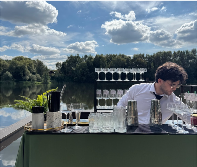 Начали мы, как и планировалось, с фуршета у воды — тут главным украшением была сама природа, солнце, легкий ветерок, вид на парк и пруд. Гости прогуливались по территории, фотографировались, кто-то даже успел выложить сторис с подписью «Лучший корпоратив ever».