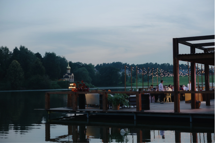 Ну и завершили вечер конечно же танцы. Здесь нам очень пригодилась открытая часть веранды: свежий воздух, гирлянды огней и профессиональный DJ. Кто-то танцевал, кто-то сидел у воды с бокалом шампанского. Идеальная комбинация для гостей разного возраста и статуса.