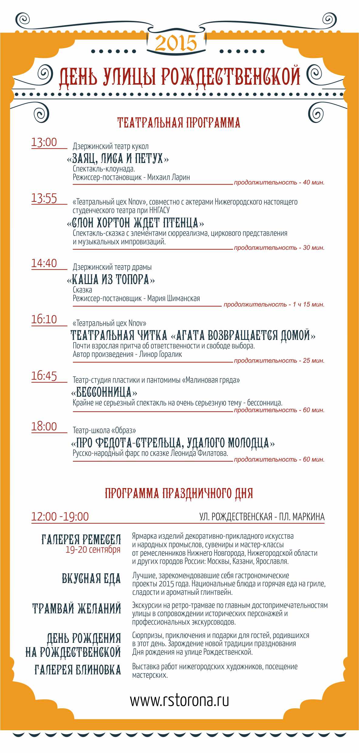 В этом году общегородской праздник пройдет под девизом «Театр под открытым небом». Площадь Маркина превратится на один день в импровизированную сцену, на которой шесть нижегородских театров покажут свои спектакли.