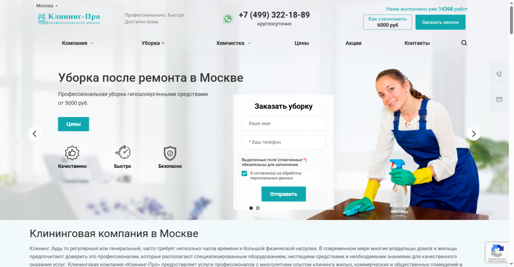 Klining-Pro обеспечивает комфортное рабочее пространство через идеальную чистоту с применением современных технологий и инновационных подходов к клинингу. Все объекты заказчиков застрахованы на 2 млн рублей, что дает дополнительную уверенность в сохранности имущества. Компания работает с гипоаллергенными экологически чистыми средствами и предоставляет возможность оплаты только после завершения уборки, когда результат полностью вас устроит. В штате трудятся 84 опытных клинера, прошедших обучение по различным видам уборки — от ежедневной поддерживающей до генеральной после ремонта или пожара. Свободные бригады позволяют обеспечивать выезд в день звонка даже в пиковые периоды. Специалисты работают незаметно для сотрудников компании, используя тихую технику и средства без резких запахов. Помимо стандартных услуг, компания предлагает химчистку мягкой мебели, промышленный альпинизм для мытья фасадов и глубокую дезинфекцию всех функциональных зон офиса.