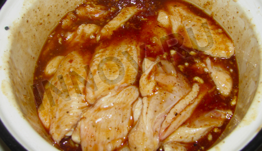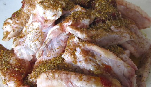Подготовленные кусочки сложим в глубокую форму. Добавим по вкусу соль, перец, а также любые острые специи(паприка, приправы для гриля и курицы, карри, хмели-сунели...). Количество специй зависит от того, насколько "огненными" Вы хотите получить крылышки.