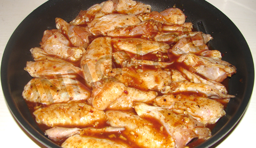 Уберем крылышки мариноваться в холодильник на 3-4 часа (лучше на ночь!). После выложим кусочки курицы в огнеупорную плоскую форму (крылышки не должны перекрывать друг друга!).