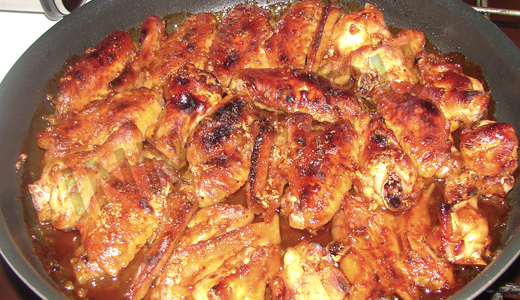 Ингредиенты: крылья куриные - 12 шт. мед - 2ст.т. кетчуп или томатный соус - 3ст.л. чеснок - 5долек перец соль специи |