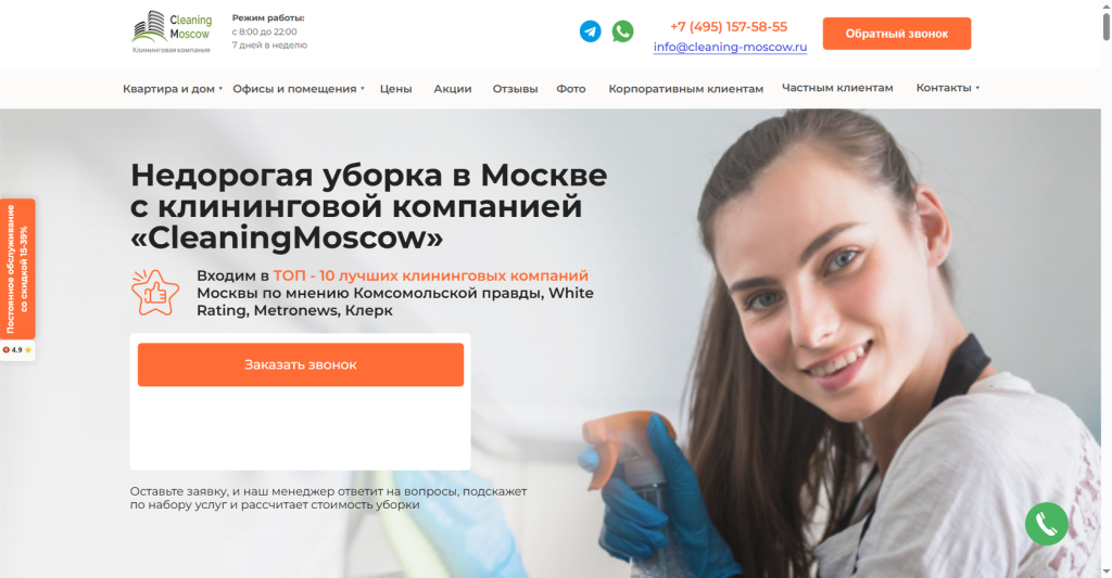 Cleaning Moscow создает безупречную чистоту для корпоративных клиентов уже более десяти лет, выполнив свыше 250 000 уборок площадью от 50 до 100 000 м² по всей Москве и области. Их подход к клинингу офисов выделяется личным контролем руководителя группы менеджеров на каждом объекте и прямой связью с владельцем бизнеса — вы всегда можете написать генеральному директору и получить оперативный ответ. В штате трудятся более 2000 специалистов славянской внешности с опытом от 3 лет, прошедших обязательную стажировку и аттестацию каждые 90 дней. Каждый клинер работает по персональной технической карте, подобранной под тип помещения, и использует только сертифицированные гипоаллергенные средства марок Kiehl, Grass, Buzil без резких запахов.
