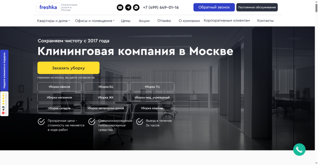 Современная клининговая компания Freshka обеспечивает офисы Москвы и области качественной уборкой по европейскому стандарту ESIS с 2017 года. В их арсенале — профессиональная техника Cleanfix и специализированные средства Buzil, Pro Bright, позволяющие выполнять все виды уборки. Штат из 100+ проверенных сотрудников проходит тщательный отбор и стажировку под руководством опытного наставника, что гарантирует, что клинеры знают свое дело и соблюдают все нормы СанПиН.