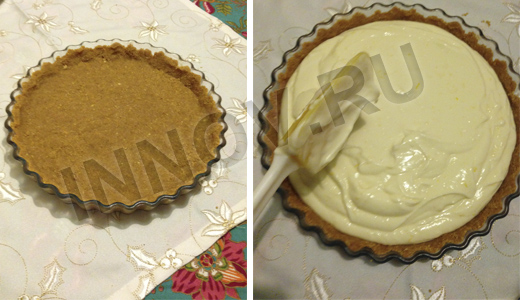 Основу из печенья выложить в форму, утрамбовать руками по краям, поставить в холодильник на 30 минут.