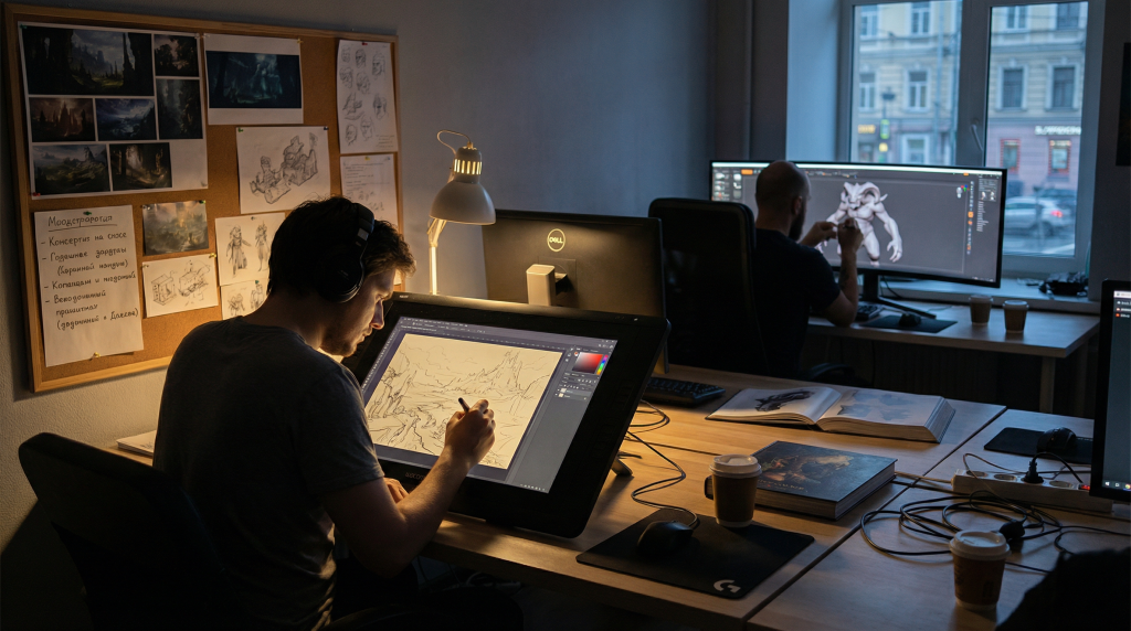 Концепт-художник (concept artist) переводит замыслы геймдизайнеров на язык визуальных образов. Этот специалист рисует эскизы персонажей, локаций и снаряжения, задавая стиль всему проекту ещё до начала технической разработки.