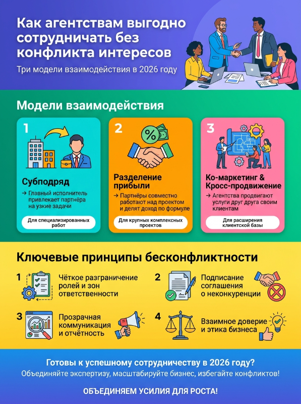 Сотрудничество агентств в 2026 году — это уже не редкость, а рабочий инструмент роста. Главное — выбирать надёжных партнёров, прописывать правила и держать коммуникацию открытой. Тогда риски минимальны, а возможности — максимальны.