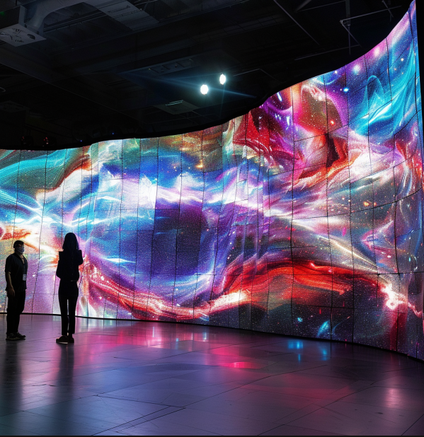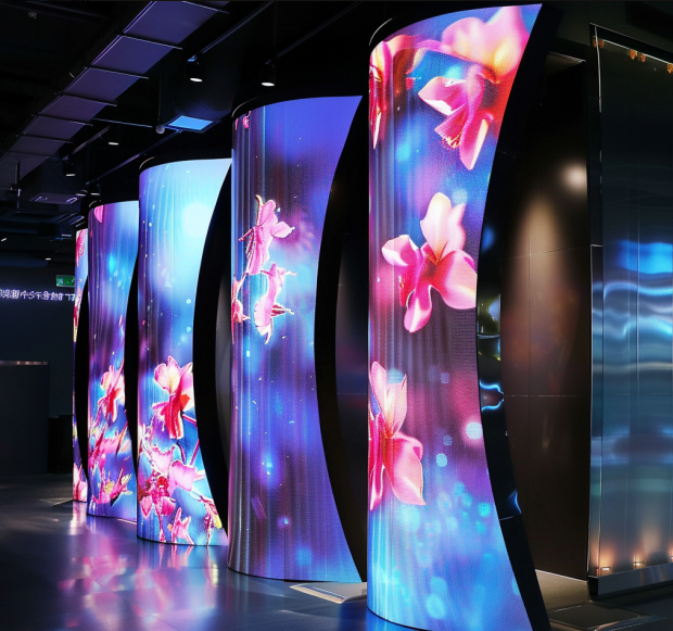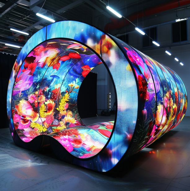 Экраны могут огибать различные объекты, создавая плавные переходы и интеграцию с архитектурой здания. Это особенно актуально для рекламных и информационных дисплеев в торговых центрах и на выставках.