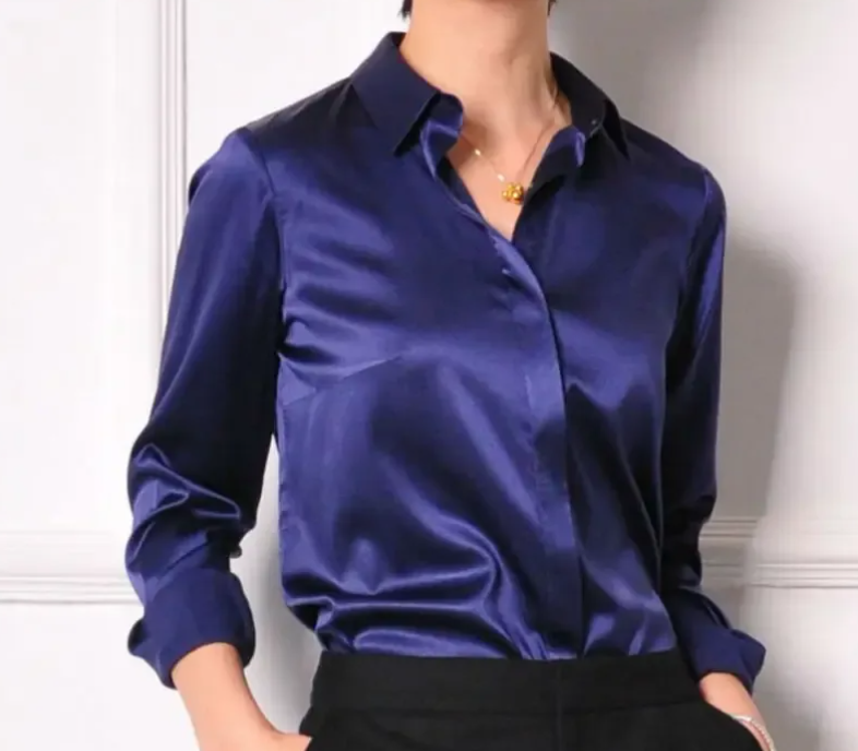 Классические, напоминающие мужские. Строгий и элегантный вариант, который станет частью гардероба для деловых встреч, работы в офисе. Особенно хороша такая атласная женская рубашка в белом цвете.