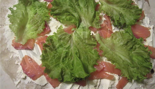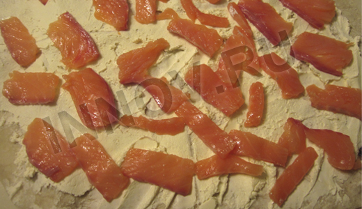 О блюде: Легкая и вкусная закуска из слабосоленой семги, нежного сливочного сыра и ярких салатных листьев. Приготовление: Лист лаваша развернем и разложим на ровной плоской поверхности. Намажем лист лаваша тонким слоем сливочного сыра. ![]() Семгу нарежем тонкими кусочками и хаотично разложим следующим слоем.