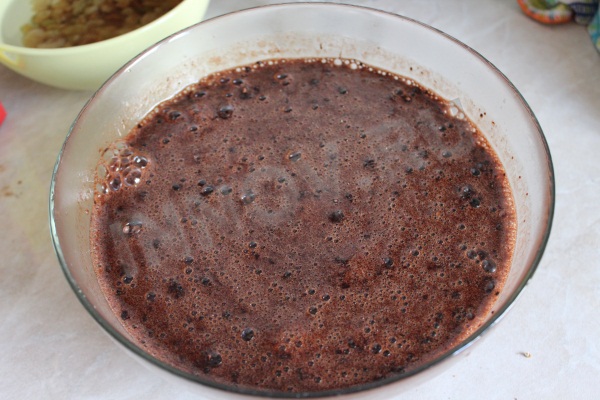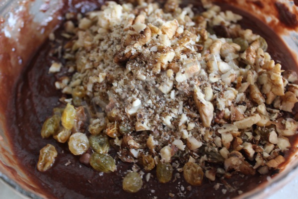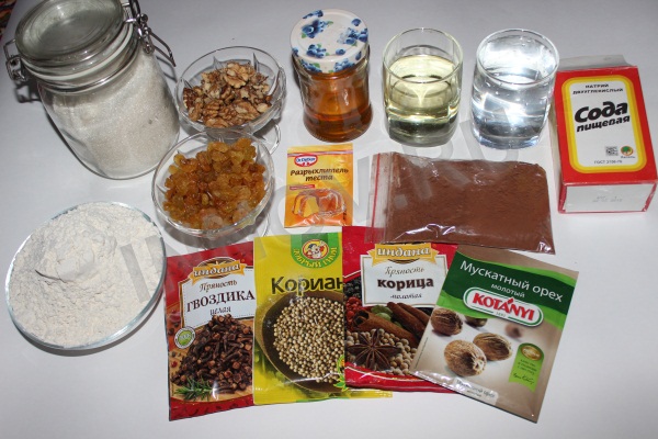 Ингредиенты: вода очищенная - 1 стакан масло растительное - 0,5 стакана мед - 2 ст.ложки сода - 1 ч.ложка разрыхлитель - 0,5 ч.ложки орехи грецкие - 0,5 стакана изюм без косточек - 0,5 стакана какао-порошок - 2 ст. ложки мука - 1-1,5 стакана мускатный орех - на кончике ножа корица - 1 щепотка гвоздика - 3-4 соцветия кориандр - 5-6 горошин. |